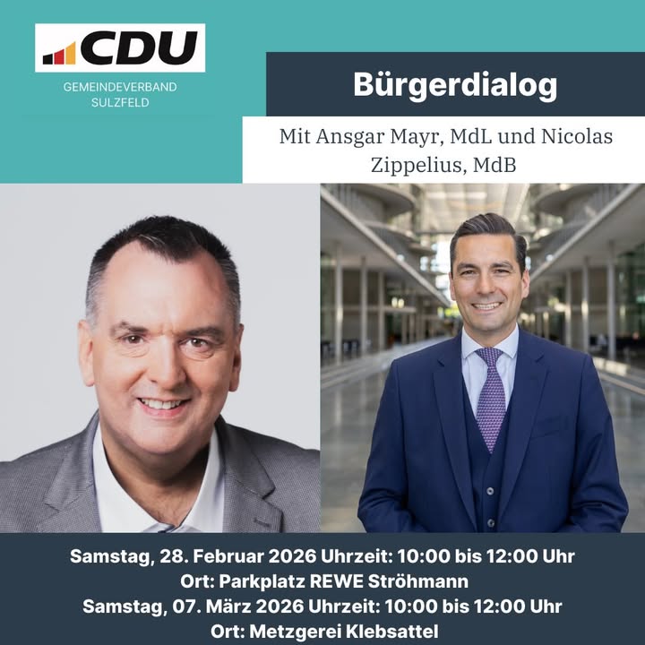 Einladung an alle Bürgerinnen und Bürger zum Dialog mit Ansgar Mayr und Nicolas Zippelius - am Samstag, den 28.02.2026 von 10 - 12 Uhr auf dem Rewe Parkplatz- am Samstag, den 07.03.2026 von 10 - 12 Uhr bei Metzgerei KlebsattelStellen Sie Ihre Fragen, Anliegen und Anregungen direkt an unsere Abgeordneten und nutzen Sie die Möglichkeit zum persönlichen Austausch.Wir freuen uns auf Ihr Kommen!Fotograf Ansgar Mayr: Marcel DitrichFotograf Nicolas Zippelius: Privataufnahme#CDUSulzfeldZaisenhausen#cdu #cdusulzfeld #cduzaisenhausen #zaisenhausen sulzfeld wegenmorgengehwählen ansgarmayr nicolaszippelius